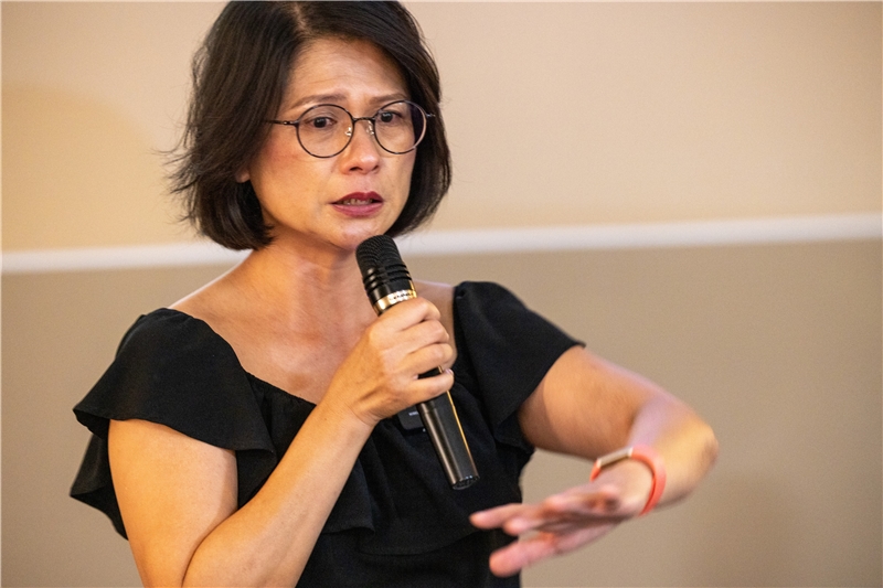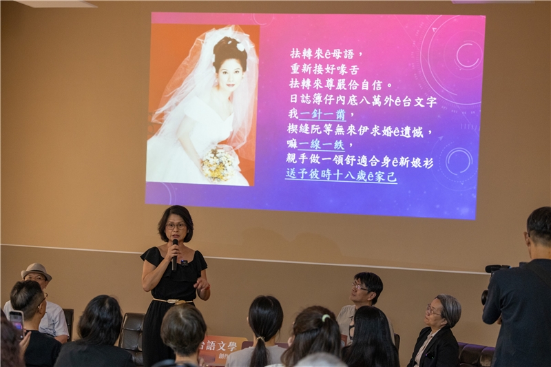 直到她開始練習把台語撿回來,用台語書寫了八萬多字的日記,她發現母語書寫不只讓她「重新接好喙舌」,也「抾轉來尊嚴佮自信」。她甚至前往男方家門口——的對面,「啞口新娘家己嫁,全程照臺灣嫁娶ê古禮」,帶著十八歲的自己舉行了一場未完成的婚禮儀式。隨著吳品瑜生動且入情的講述,現場聽眾一下子被帶到用父權與階級羞辱的現場,跟著她悲憤落淚,也跟著她大腿出力「tsàm破階級ê瓦」,看見她終於釋懷、放下這段憋屈過往的瞬間。這篇改寫自台語日記的散文不僅讓她獲得文學殊榮,也療癒了深埋內心的傷口。