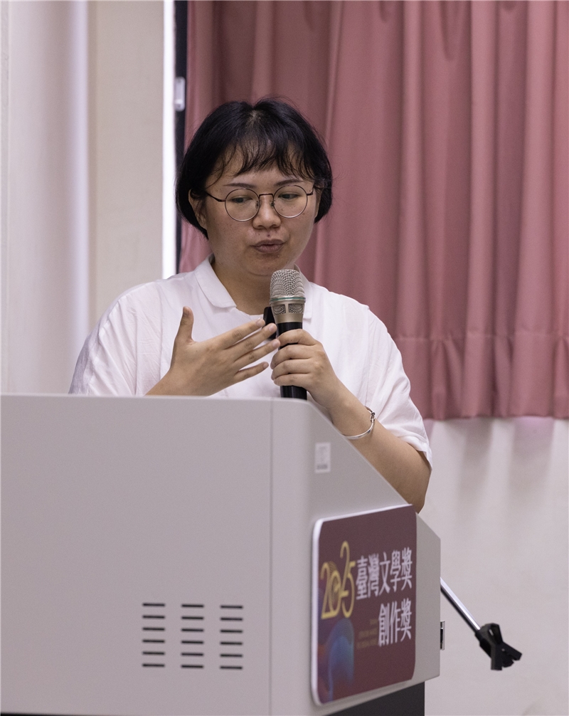 接著登場的是散文獎得主麗度兒.瓦歷斯。她以「我想跟你說一個故事」為主軸,分享自己從日常生活進入文字創作的經驗。她的第一篇作品〈謊〉書寫高中生活,而〈Yaki的小姐時代〉則是以祖母和外婆為主角,描述其年齡相仿,卻活出截然不同生命樣態的故事。她說自己的創作多半來自身邊最熟悉的故事,書寫的策略是先從素材中找尋「差異性」與「相似性」,再進一步提煉靈感與主旨。