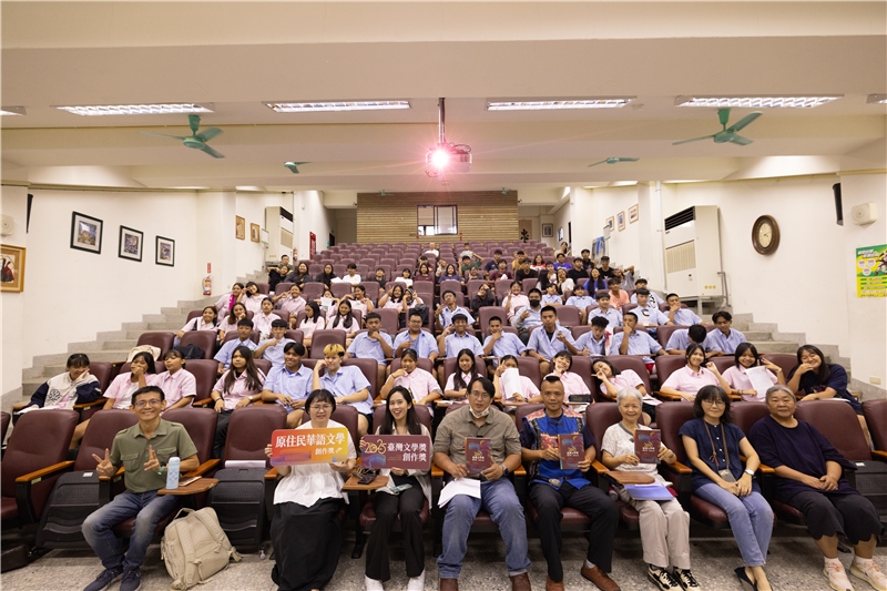 9月13日午後,位於屏東鹽埔鄉的屏北高中圖書館,縈繞著布農族與卑南族語的歌聲,來自排灣、布農、卑南、阿美、魯凱、泰雅、賽德克等84位原民專班的學生共聚一堂,以傳統族語歌謠為創作獎第三場講座揭開序幕。現場由創作獎評審——乜寇.索克魯曼擔任主持人,並由原住民華語文學創作獎小說獎得主魯亮.諾命Lulyang Nomin、散文獎得主麗度兒.瓦歷斯以及新詩獎得主徐邱宜婕Uhay Mali Pacidal接續上臺,分享原住民華語創作的心路歷程。
