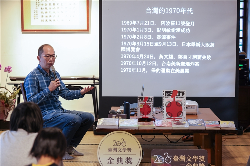 演講尾聲,黃崇凱補充了關於小說的結構規劃。原來,他書寫這本小說源自國家人權博物館邀請駐館,一開始以白恐事件為主軸,在初稿放了一年後,因為有了新感悟而加入「萬國博覽會」與「登月太空人」這兩個新章節。他認為這時代有比如烏克蘭戰爭、川普、習近平這類黑暗負能量的存在,但AI的興起似乎帶來了希望的火花。如果再回頭看1970年代的臺灣,直覺相對應的該是大阪萬博所想像的美好未來。「光明跟黑暗並存,似乎是每個時代都會有的狀態。」黃崇凱強調。