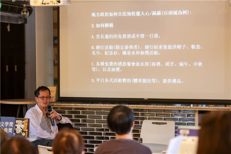 他也分享田調資料中,關於地方選舉「語言失效」的有趣例子:比如「推行政府政策宣導,一步一腳印;用心盡責,為民服務;關懷敬老,熱心公益。」諸如此類的政見,基本上,全是「廢話」。在大部分無效語言中,偶爾也會參雜「定期保養清潔溝渠,防止蚊蟲及傳染病滋生」這樣真正的政見,但可明顯看見在選舉場域中,語言不再是溝通,較傾向表演的性質。
